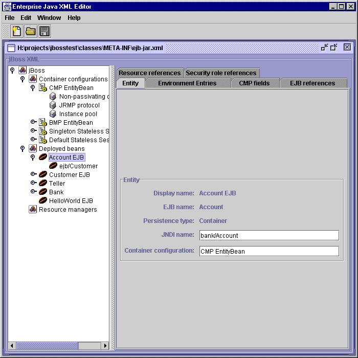 Once you have created the EJB 1.1 XML descriptor for your beans, either by manual editing of the ejb-jar.xml file, or by using the EJB 1.1 support provided in the EJX editor, it is time to add the jBoss specific configuration information. This is done by opening the ejb-jar.xml file as a jBoss configuration file. This will load the information in ejb-jar.xml, and also construct a GUI where additional settings may be made. These additional settings will be stored in jboss.xml when you select Save in the GUI.